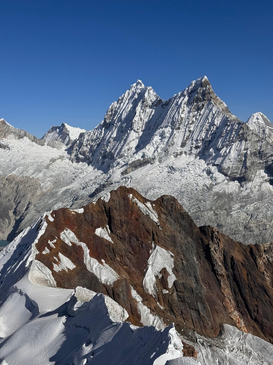 Subida ao cume com vistas de Huascarán e Huandoy.