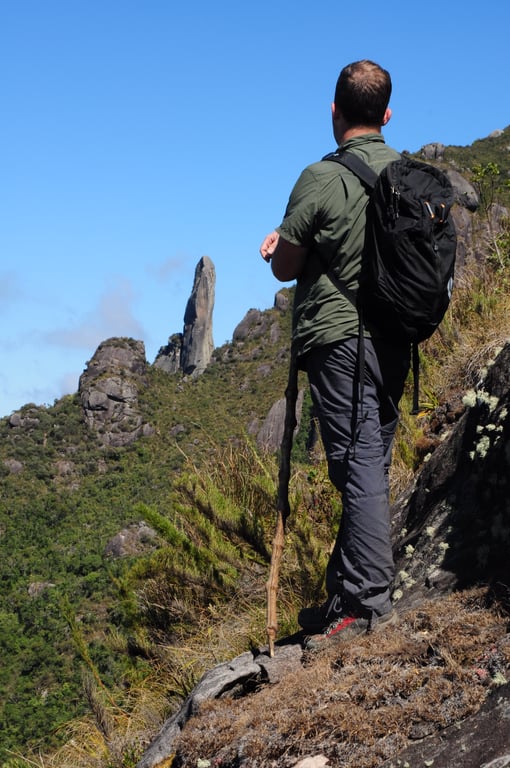 Ao longo do percurso, somos presenteados com vistas marcantes de picos imponentes da serra, incluindo a Verruga do Frade equilibrada sobre o Nariz do Frade e o Dedo de Deus visto de uma perspectiva pouco comum. A travessia segue inicialmente pelo mesmo caminho da Pedra do Sino e, no retorno, utiliza um trajeto diferente, com descida mais acentuada e trechos técnicos que reforçam o caráter desafiador do roteiro, proporcionando uma experiência intensa de imersão em ambiente de montanha.